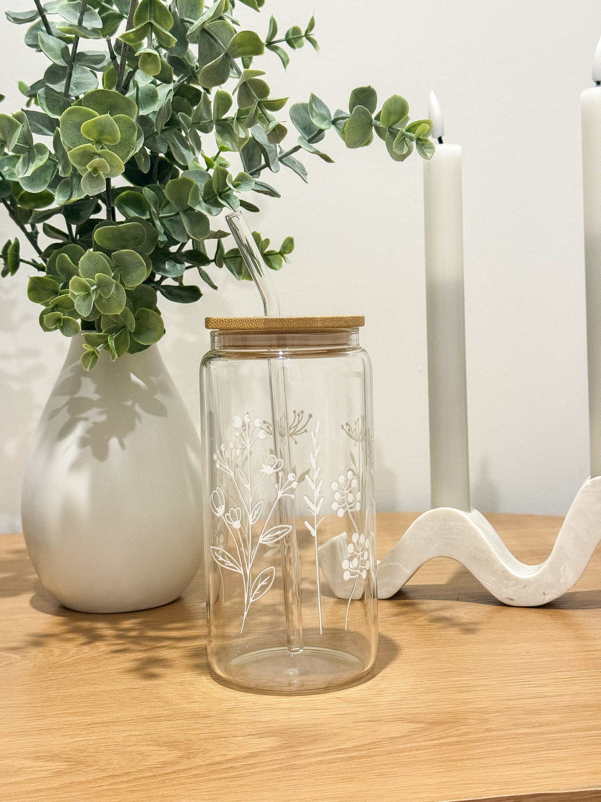 Sip in style with this beautifully crafted glass cup, featuring a delicate white floral design that adds a soft, whimsical touch to your daily drink. Perfect for iced coffees, teas, smoothies, or your favourite refreshers, this cup brings a little bloom to every sip.
