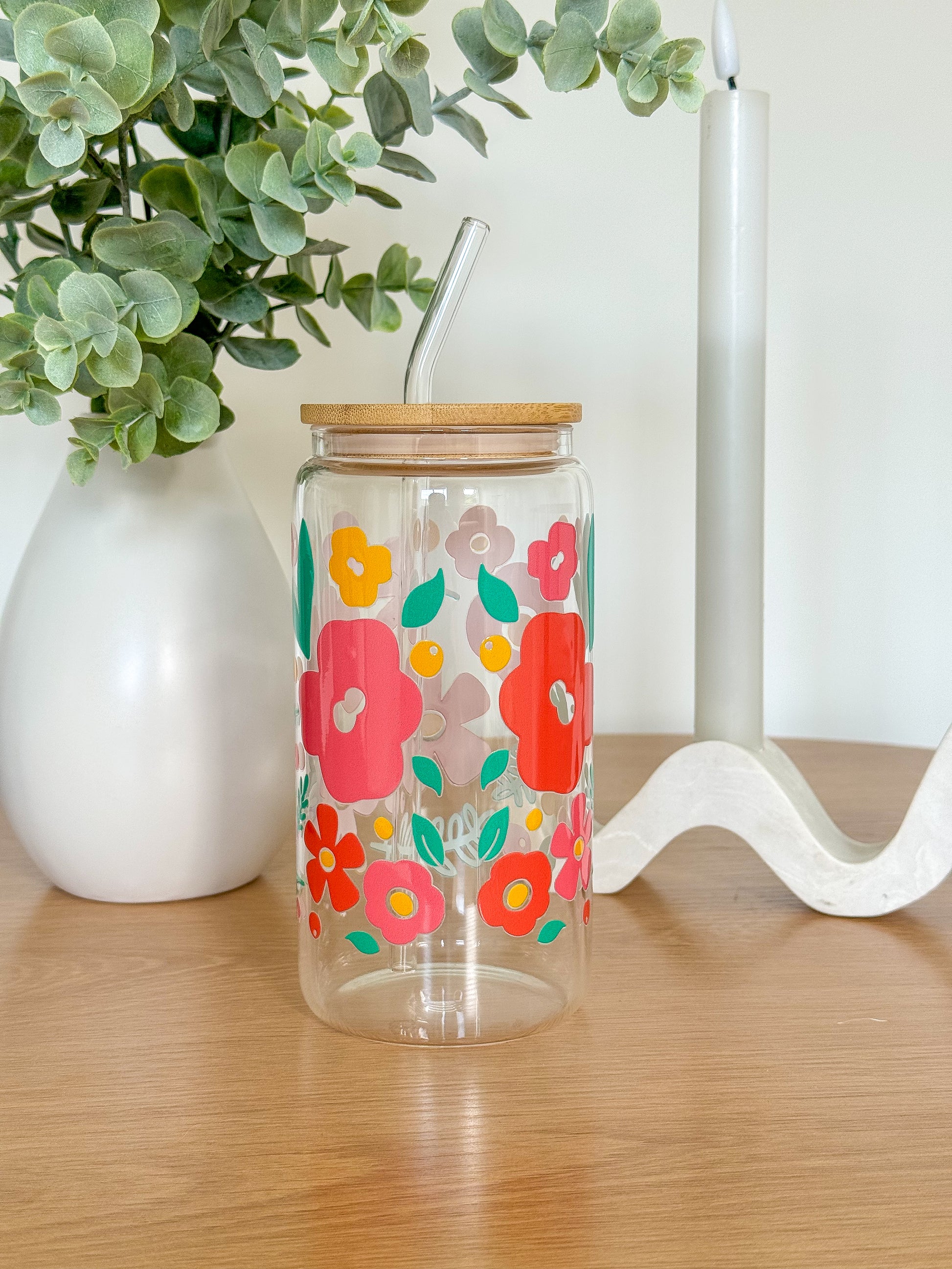 Bring on the good vibes with this colourful retro flower glass cup! Covered in vibrant, groovy florals, it’s giving pure sunshine energy with every sip. Perfect for iced coffees, smoothies, or your go-to refresher, this cup adds a fun pop of colour to your everyday routine.